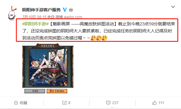 其次,除了在游戏、论坛等自家平台内提供服务之外,它也逐渐将服务的响应和宣传领地外拓至微博、各种问答平台。打开新浪微博,你能看到认真在运营的“阴阳师手游客户服务”账号,除了提供正常玩家咨询回复,还与不断更新的游戏相关的活动、玩法、周边都做了连接(如图3)。