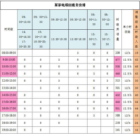 大部分运营中心在项目刚开台时会根据合作方的要求,依照合作方提供的预估数据量及班务案例进行简单的班务编排,将班务进行固化,未在运营过程中仔细研究各时段的实际来话趋势与班务是否吻合。