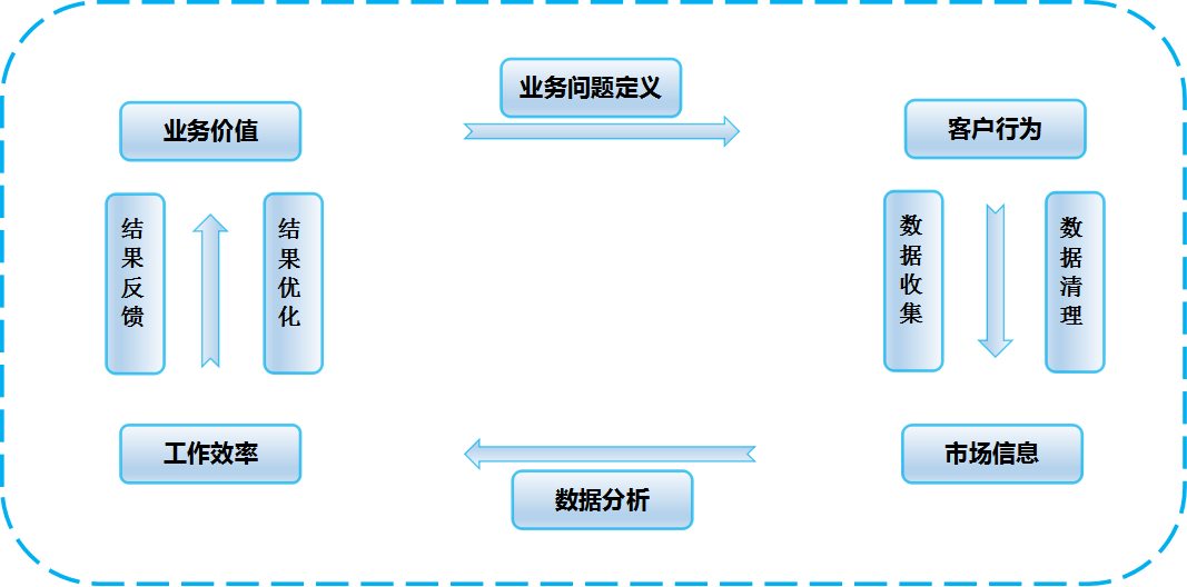 现阶段数据分析方法层出不穷,让人眼花缭乱。无论是“高大上”的大数据模型还是“简单实用”测算表格,其实涉及到的都是一个数据分析的基本流程。“新客服”数据分析流程无论如何循环分析,都是数据分析需求来自于业务并最终运用到业务,而最实用、最基础的流程是业务问题定义、数据收集、数据清理、数据分析、结果反馈、总结优化的关键点的螺旋式循环,推动业务不断提升(如图1)。