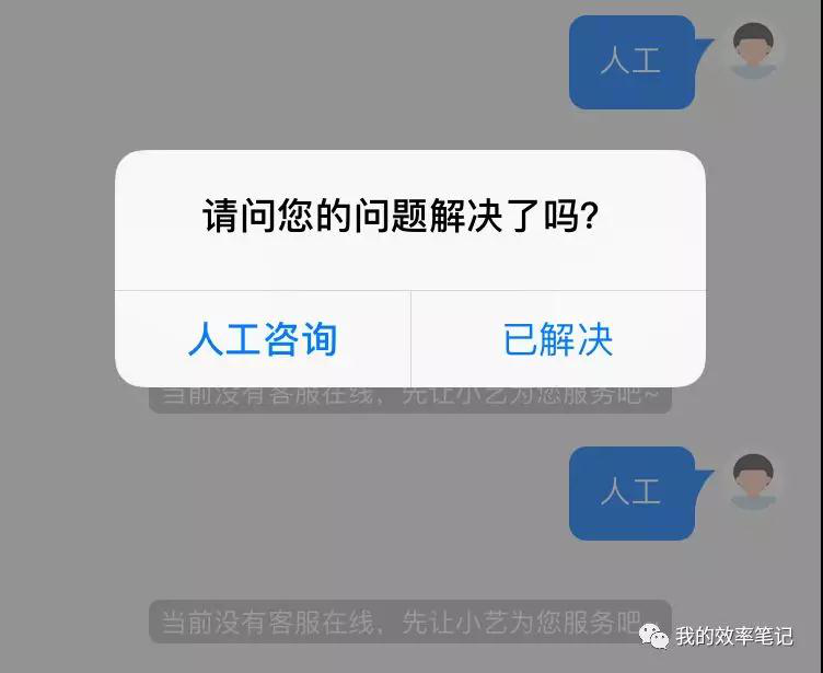 由于笔者本能地对是个公司就用“机 器人”心生抗拒,更不敢苟同遍地的“智能”,所以进入在线咨询后毫不犹豫地输 入“人工”。正常情况下“机器人”识别 出人工需求会跳过自动应答转到人工服 务,小艺做到了这一点,只是为什么页面显示当前没有客服在线?再深入想想有点 疑惑,“没有客服在线”是什么意思?是不在人工服务时段,没有任何人工客服在线?还是人工客服都在忙,没有空闲客服在线?这句话说的有点含糊(如图 1)。