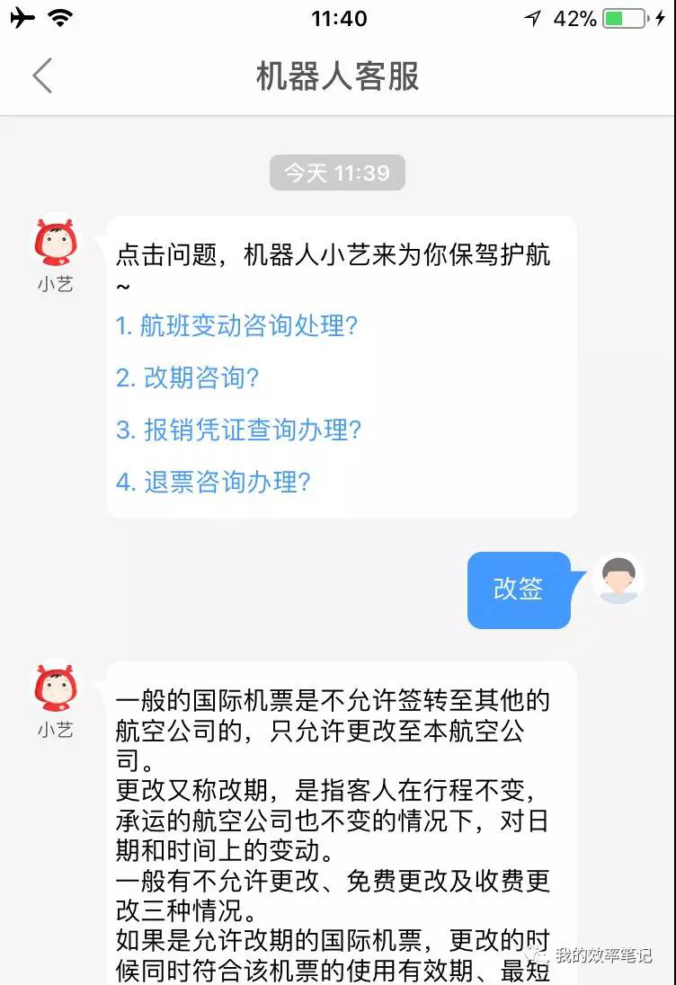 不得已,笔者只能用了一下“机器 人”小艺,存在的问题也很明显,正如我在文章中曾指出的,自动应答还停留在 FAQ 阶段。从图中答案的表述看,可以看出处于“通用问题库”状态。虽然进入 自动应答的时候貌似选了某个具体订单, 但机器人回答内容和订单没有半点关系。 按照大多数场景,这个时候我问“改签”, 机器人应该直接告诉我这个订单能不能改签、如何改签,而不是回复“一般 / 如果” 句式的通用型答案。归根结底,只要没有和我的订单结合起来就是没有真正听懂我 的问题,这无关NLP,所以折腾几下之后笔者还是没有得到自己想要的简单、明确的答案。如果当时我方便打电话,电话渠道想必会增加一通人工电话。