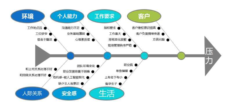 图2是根据前期对一线客服专员的调研及访谈,汇总出座席人员日常压力原因鱼骨图,主要由客户、工作要求、个人能力、环境、人际关系、安全感、生活7个维度23项原因构成。