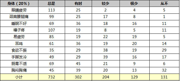 针对新员工离职情况与座席压力较大的现状在客服专员中随机选取了150名入职半年内的90后座席从心理、身体、行为三个维度的不同程度做了一项问卷调查,问卷调查题目如表1所示:
