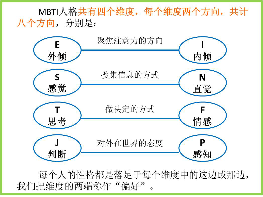 请大家先记住这八个字母,E外倾、I内倾、S感觉、N直觉、T思考、F情感、J判断、P知觉。MBTI理论把这些特点简单归纳成这样四对相互关联的维度,很好地说明了人格的注意力方向、搜集信息的方式、做决定的方式和对外在世界的态度。