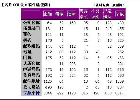 而且,就是不算名片上还有公司商标等不可识别的情况,实际错读率(错读率加上遗漏率)如果达到25.5%,那么OCR文字识别软件是不实用的。