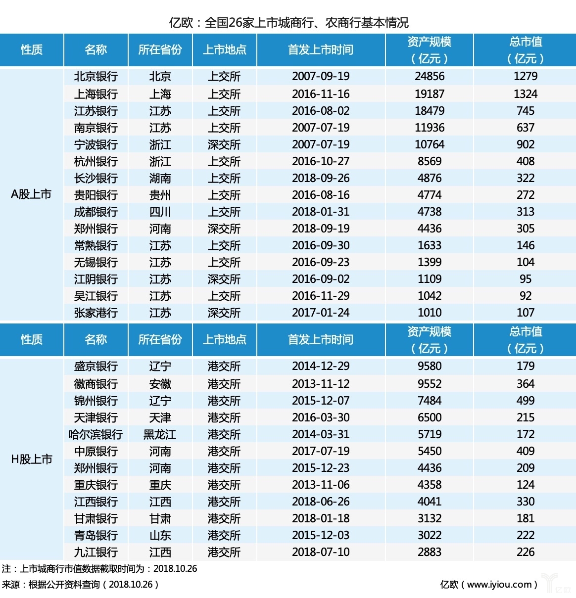 经亿欧统计,截至2018年10月26日,共有26家地方商业银行上市,为了方便大家了解城商行、农商行的基本发展情况,亿欧从所在省份、上市地点、首发上市时间、资产规模、总市值五个方面对A股、H股上市的城商行、农商行进行了梳理。各类城商行的基本情况如下(表1):