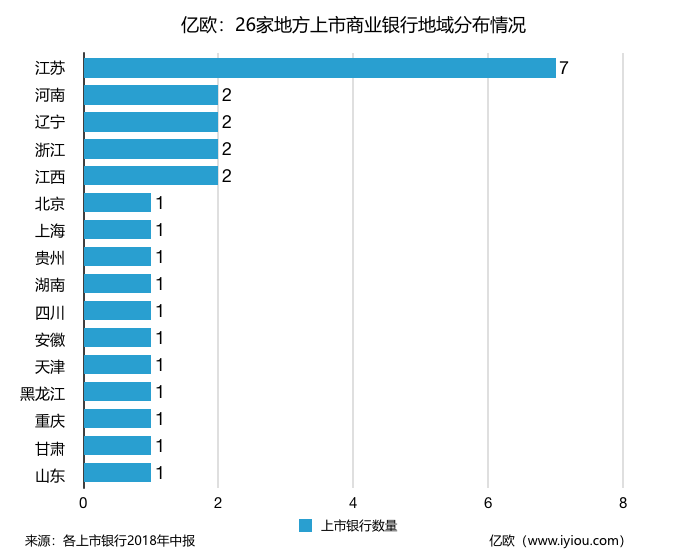 在地域分布上,江苏省的上市城农商行数量最多,共有7家,河南、浙江、辽宁、江西数量位列第二,共2有家。北京、上海、湖南、四川、天津等十一个省份只有一家地方上市商业银行。