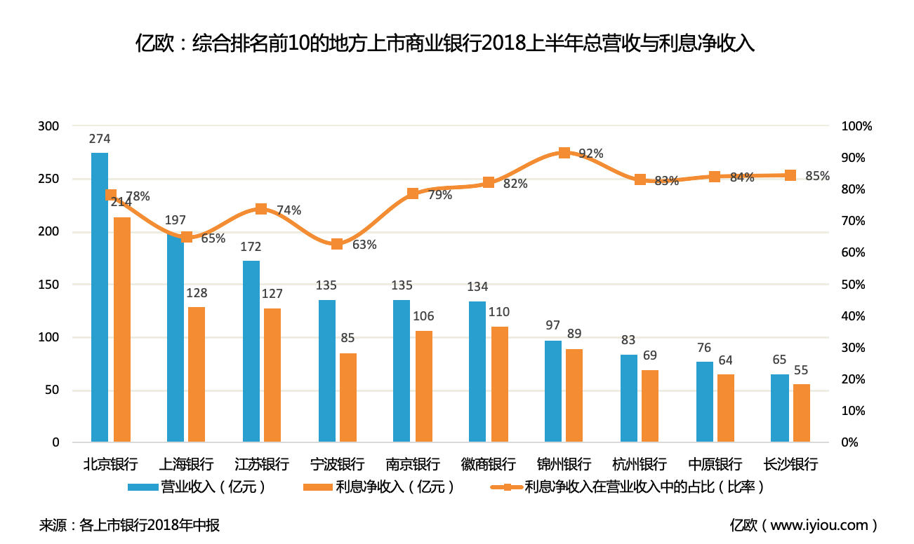 银行的收入主要来自于利息收入和非利息收入,目前利息收入仍是商业银行的绝对支柱。从图中来看,利息净收入超过百亿元的城商行有5家,分别是北京银行、上海银行、江苏银行、南京银行、徽商银行。近80%的银行利息净收入在100亿元以下。