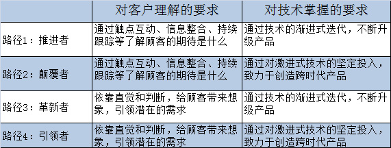 今天的商业活动是由顾客主义的逻辑主导的。但是顾客主义的战略逻辑并不意味着只有一条路径。企业仍然可以根据自己对于顾客需求的理解,以及技术应用的倾向,选择成为推动者、颠覆者、革新者或引领者。这代表了顾客主义的不同实现路径。