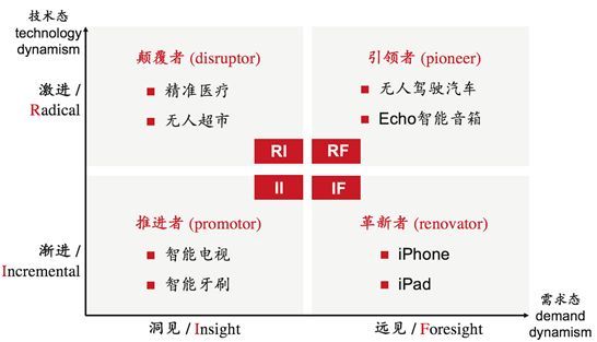围绕顾客的不同需求,借助不同的技术力量,我们发展了“推进者(II)”“颠覆者(RI)”“革新者(IF)”“引领者(RF)”这四种不同的战略选择。那么,企业如何在这四种战略中进行选择呢?这四种战略本身并没有优劣之分,企业的选择在很大程度上取决于自身的初心和基因——从而找到和自身“气质”最匹配的那个组合。
