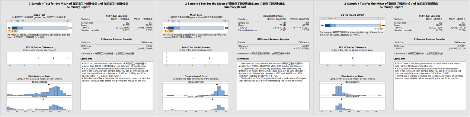 2.两类员工的“平均通话时长”无显著差异。