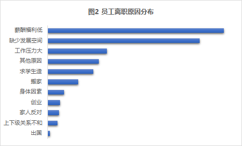 这样的结果,让我们几个朋友都有些意外,但仔细想想也在情理之中。员工提出离职,并不一定代表这个员工会消极怠工。由此联想到曾经做过的员工离职调研,其中有一条就是询问离职的原因。从调研结果来看,导致员工离职的最主要因素是“薪酬福利”和“发展空间”(如图2)。