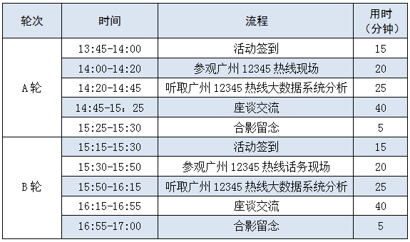 1.参观单位需要提前十五分钟到达广州12345热线签到等候,随后工作人员安排参观讲解。