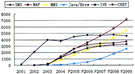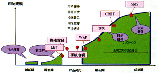 经过几年的高速发展之后,增值业务市场用户教育已经基本就绪,多数早期业务如SMS、CRBT、IVR已经跨过产业鸿沟期,进入市场成长期,个别业务已经进入市场成熟期。移动增值的业务种类也开始从简单娱乐类、信息服务类逐渐向行业应用和更高级的休闲娱乐发展。带宽与终端技术的改善也为新的业务渐次展开做逐步准备了充分的基础。