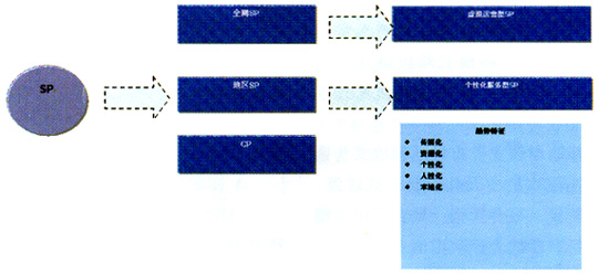 区域SP和特色SP由于特殊资源的存在,可能更容易在市场中分一杯羹。区域SP和全网SP有着不同的经营模式和管理模式,它们对本地文化有更深的理解,可以针对本地用户开发地方特色性应用。特色SP在业务、资源或其他方面,与其他SP相比较有鲜明的不同,在产品、营销同质化严重的竞争市场中,特色本身就意味着市场。