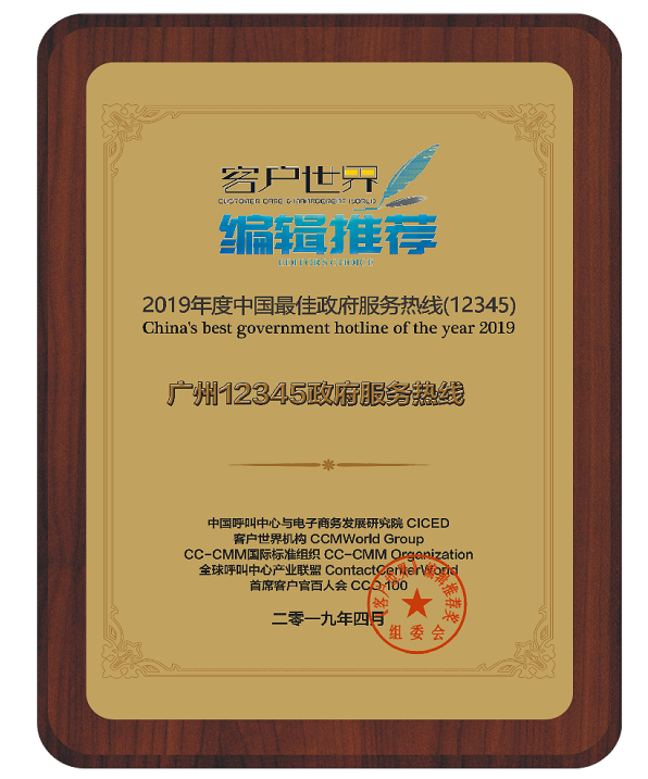 转载请注明来源:广州12345政府服务热线荣获《客户世界》编辑推荐:2019年度中国最佳政府服务热线(12345)