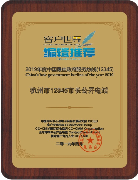 杭州市12345市长公开电话 荣获《客户世界》编辑推荐:2019年度中国最佳政府服务热线(12345)