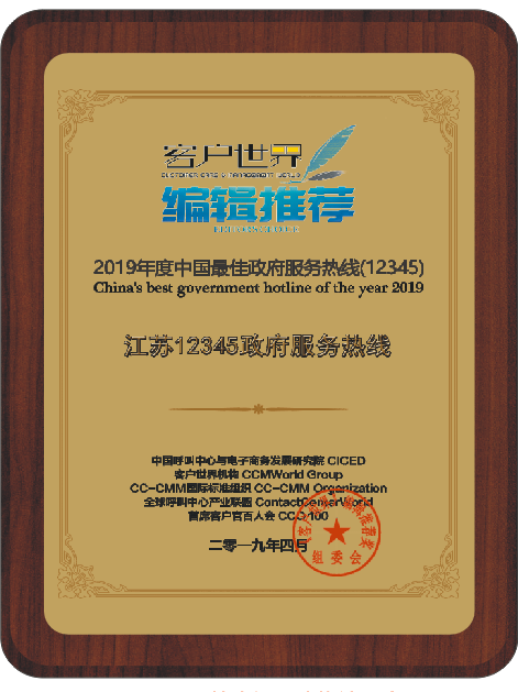 江苏12345政府服务热线荣获《客户世界》编辑推荐:2019年度中国最佳政府服务热线(12345)