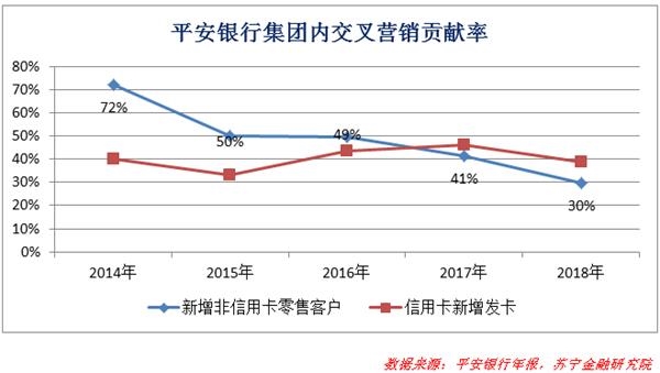 从数据上看,平安银行大量新增用户来自平安集团内部。2014年,72%的新增零售(不含信用卡)用户来自平安集团内部,2018年,也有300万的新增用户来自交叉营销渠道,占比30%。新增信用卡用户中,也有四五成来自交叉营销渠道。