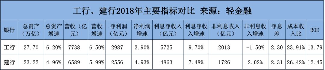 从营收增速上,工行略胜。工行2018年实现营业收入7737.89亿元,同比增长6.50%。建行实现营业收入6588.91,同比增速为5.99%。