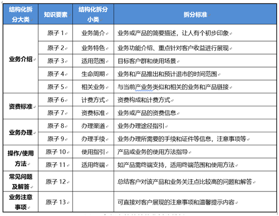 结构化的方法是根据信息的特点和属性,一类知识可以通过一个共性的结构来描述,这个抽象的知识结构需要知识编辑人员基于对业务的理解,对某一类信息总结出通用结构化描述模板,用模板完成具有同类特点和属性信息的知识编辑,转换成结构化的知识。例如产品维度的信息,可以抽象出产品名称、产品介绍、收费标准、业务办理、促销政策、适用范围等原子,通过这个结构化的编辑模板组合成一个产品知识。结构化解决的问题是根据知识调用意图,想要什么就能给他什么,而不是把大堆知识一股脑推出去让知识应用根据需要选择再加工。举个例子,把知识按业务介绍、资费标准、购买方式、使用方法、注意事项等拆成一个个原子后,当需要调用“来电显示“这个业务每月收费多少时,只要调用资费标准这个原子里面的内容就可以了。