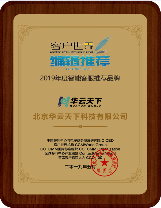 华云天下荣获《客户世界》编辑推荐:2019年度“智能客服”推荐品牌。