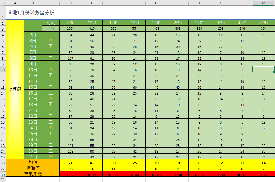 一般来说,变量值平均水平高,其离散程度的测度值越大,反之越小。如果单位和(或)平均数不同时,比较其变异程度就不能采用标准差,而需采用标准差与平均数的比值(相对值)来比较。由此可见,离散系数越大,说明波动越大,由此我们可直观地看到48点话务量波动情况。