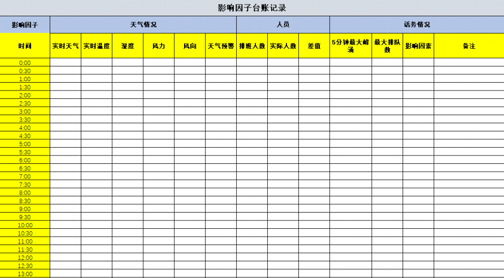 图5为现场记录因子的简单模板,而此模板仅作为在遇到异常话务情况下填写,只需填写异常突发时段数据,如无异常突发情况无需填写。当然各客服中心情况不同,也由此可以作为借鉴进一步改良创新,或长期记录填写。