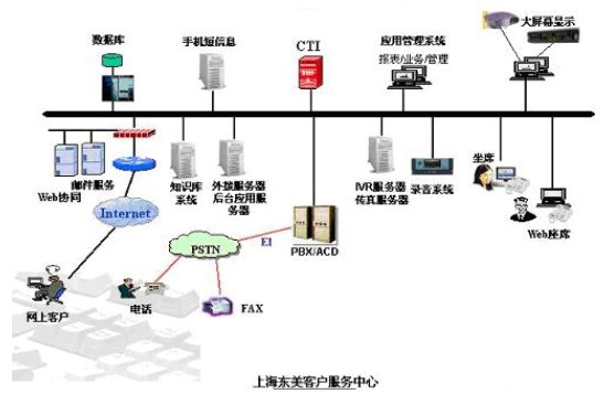 基于AVAYA 交换机,在呼叫中心的中心点部署PBX、CTI服务器、IVR服务器以及座席应用等整个系统中最基本、最为核心的组成部分。辅助系统包括录音系统、传真服务器、外拨服务器、应用管理系统、知识库系统、大屏显示系统、TTS等。