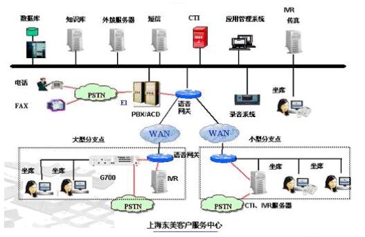 中心点和分支点的客服系统通过两地的语音网关进行语音连接,具体实现大概是,如果分支点需要把语音转接到中心点,分支点把TDM语音转接到语音网关,语音网关把TDM语音信号转变为IP包,通过网络发送到中心点的语音网关上,语音网关把IP包变为TDM语音信号,在接入到交换机上,由中心点CTI按照指定的策略转接到最终目标上。