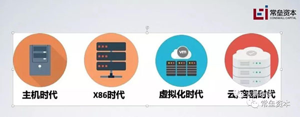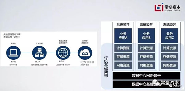 硬件角度,宇宙行从最贵的主机一直玩到了普通的PC X86 服务器。软件和架构层面也发生了一系列变化。以前是来一个新项目,买一套硬件软件;开发一套,上马一套。其实这样浪费很多很多。等到2000年后虚拟化技术上来了。可以把一台或者几台服务器虚拟成一个小池子,然后想分蛋糕一样任意分割一下计算资源、存储资源、网络资源。这样就大大利用的机器的剩余资源。