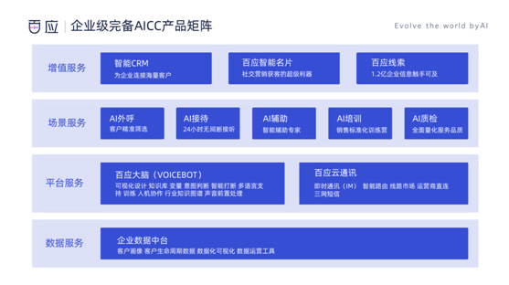 2016年9月,百应科技成立,基于NLP、机器学习算法等先进的人工智能和大数据技术,在2017年8月发布AICC智能营销平台,其后通过不断更新迭代逐渐完善智能营销产品矩阵和解决方案,相继推出了百应Voicebot、百应云通讯、百应智能CRM以及百应智能名片等产品,全面覆盖企业AI外呼、AI接待、AI辅助、AI质检、AI培训等营销场景,构建企业智能营销、智能销售到智能服务的一体化企业智能增长引擎,帮助大中小型企业在营销环节降低成本,有效提升营销业绩。