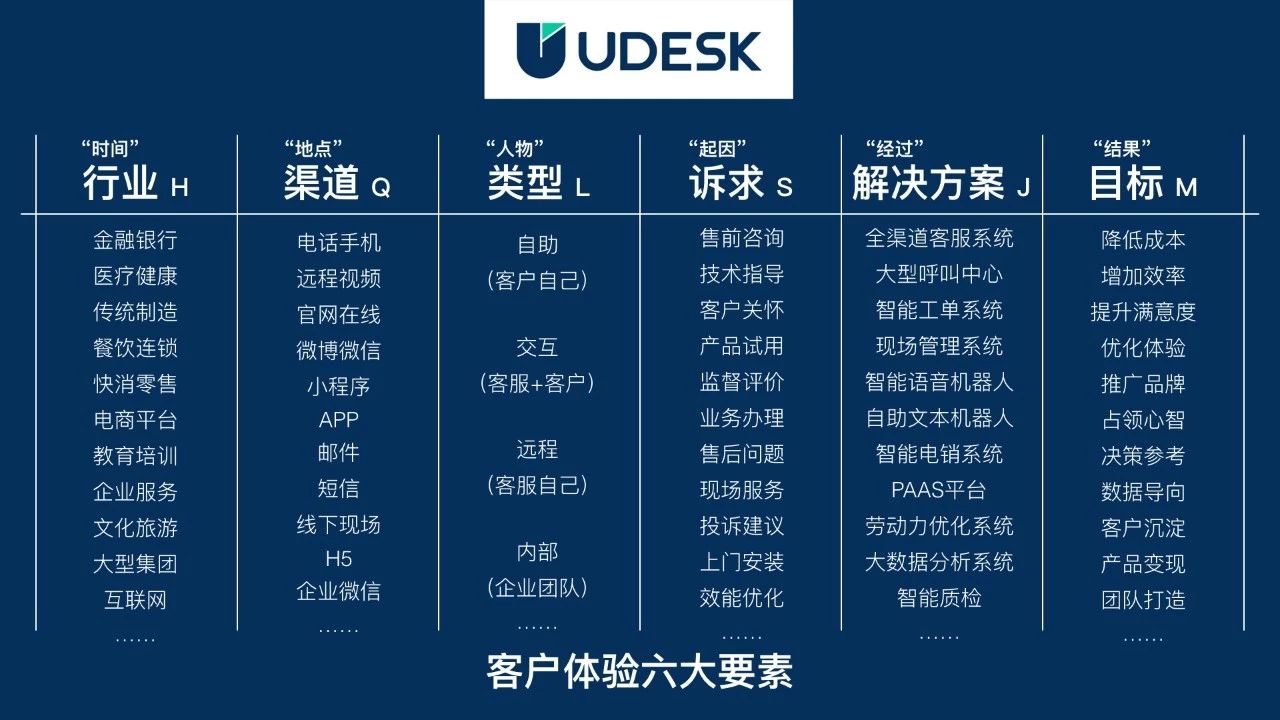 上学时我们都被语文老师要求写叙述文,写好叙述文的基本前提是要涵盖六要素:时间、地点、人物,事情的起因、经过、结果;其实早在上学时期,就已经培养我们对场景的概念和对场景的认知能力;所谓客户体验场景,甚至企业客户服务的生态体系,其实都是以客户为中心打通企业的客户端和服务端,促成数据流通、信息流通、价值流通,系统平台化,实现不同业务场景之间的共生互生再生,这就是Udesk一直强调的客户体验系统要场景化平台化。客户体验全场景其实就是六要素的无限组合:行业(时间)、渠道(地点)、类型(人物)、诉求(起因)、解决方案(经过)、目标(结果)的无限组合,每一种组合都能生成一种客户体验场景,当每个场景拥有对应的系统解决能力时,才能称为全场景客户体验平台。一方面符合企业诉求:高效便捷;另一方面,解决互联网时代下客户群体的深度需求,他们对“服务和体验”有更深的体会——从“全场景”的平台形式和AI技术结合来看,契合度非常高,也充分体现企业客服团队精准的客户洞察,切中目标客户的心理诉求。