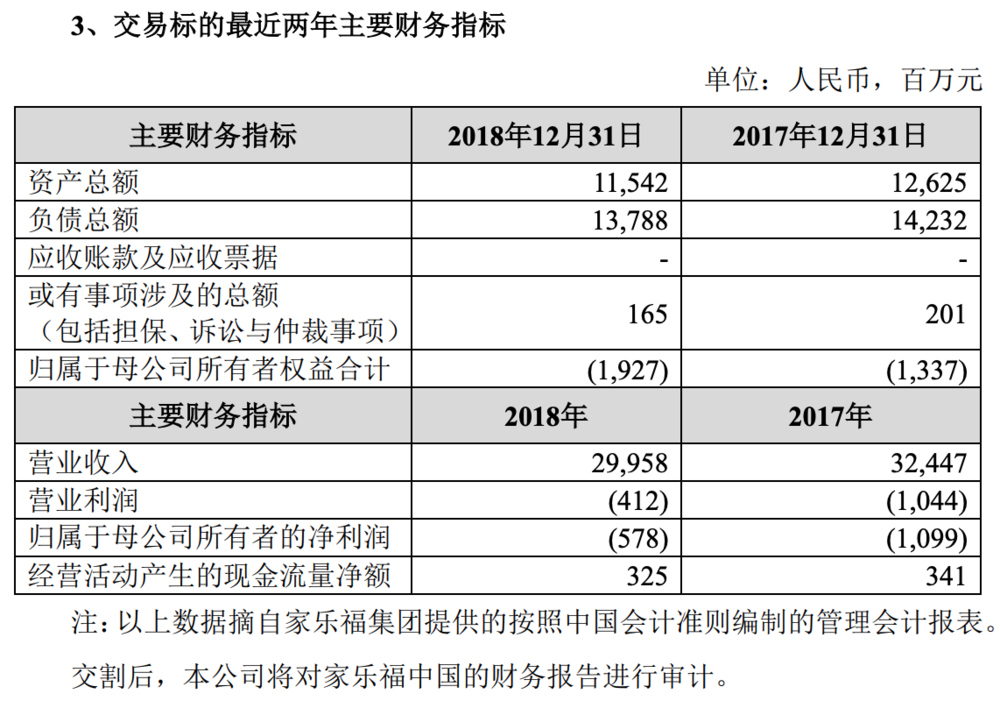 根据家乐福集团提供的未经审计的管理会计报表,家乐福中国2018年营业收入约为299.58亿元。家乐福集团提供数据显示,家乐福中国2018年息税折旧摊销前利润为人民币5.16亿元。但根据苏宁的公告,家乐福的账面净资产为负,其2018年末归属于母公司所有者权益为-19.27亿元。
