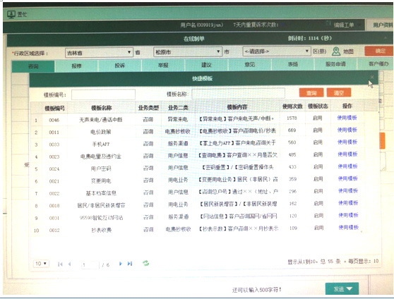 (3)新增制单模板:通过大数据筛选出客服人员常用对话,共165种,其中咨询55种、报修8种、投诉34种、举报18种、意见31种、服务申请19种,将其在系统中生成制单模板,方便座席直接点选使用,如下图所示: