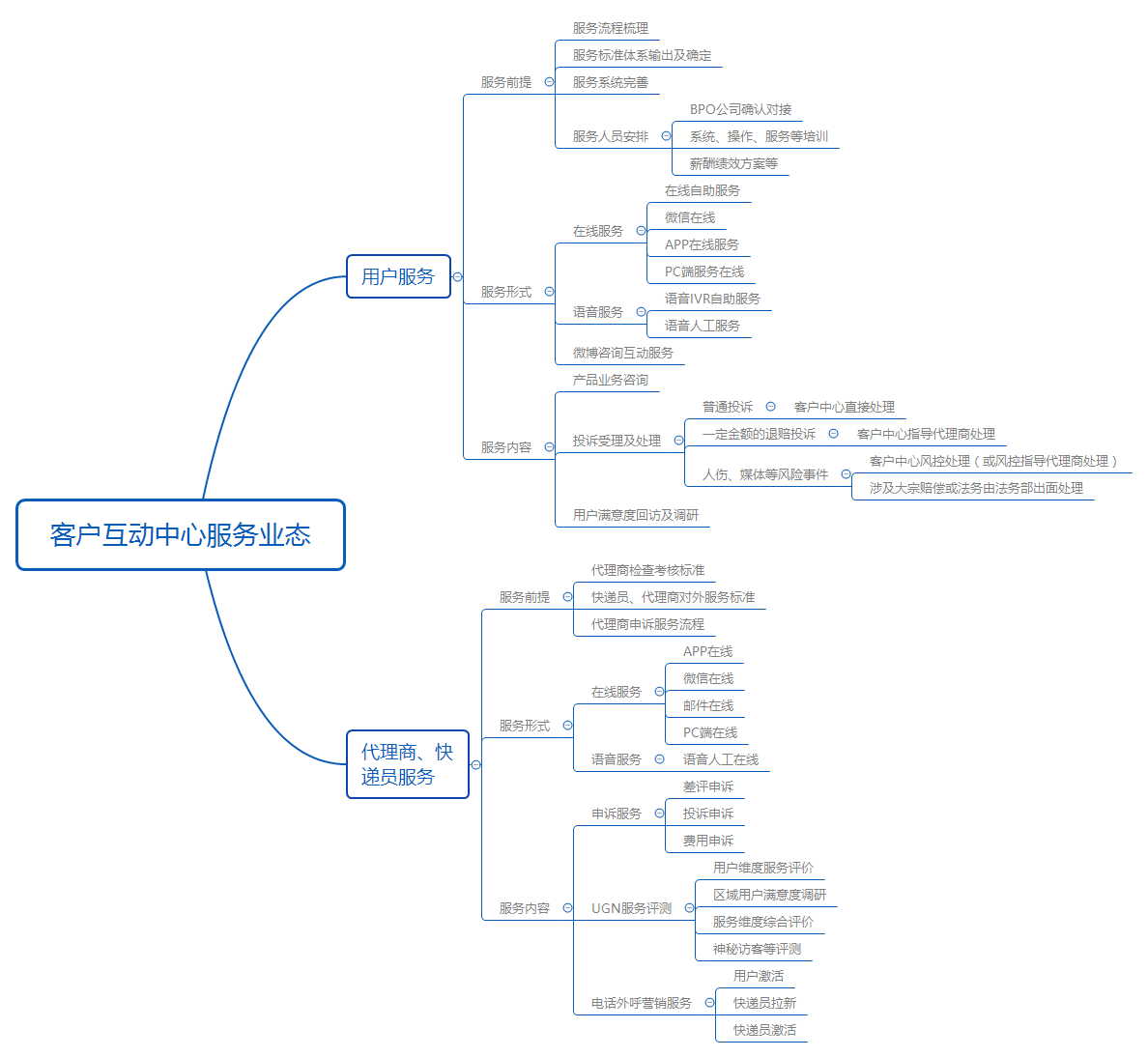 确定服务对象及服务内容后最关键的部分需要确定,客户服务中心对外服务形式及相关服务标准(次标准不仅仅针对客户服务中心,更多的是线上线下服务标准如外卖平台或网约车平台的接单时间标准或取消订单标准等等)。仍旧以笔者咨询的快递服务平台为例,被动服务主要集中为在线咨询(入口包含:网站、APP、小程序、公众号等),及电话服务及微博等新媒体服务端口,处于成本考虑对外推荐服务形式主要为在线咨询(在线咨询比较符合年轻用户的使用习惯),为降低服务成本针对低价值咨询等可以通过在线机器人自动解答或IVR语音及短信推送等形式提供服务(如快递费用咨询或物流进度查询等)。同时针对服务需要明确的标准有:快递价格(官网可查)、快递寄件标准(官网可查)、快递员线下服务标准(官网可查)、代理商考核标准制度(官网可查)、相关申诉流程等。整个第一步整理完,将形成如图1的基本轮廓及客户服务中心基本的服务策略图。