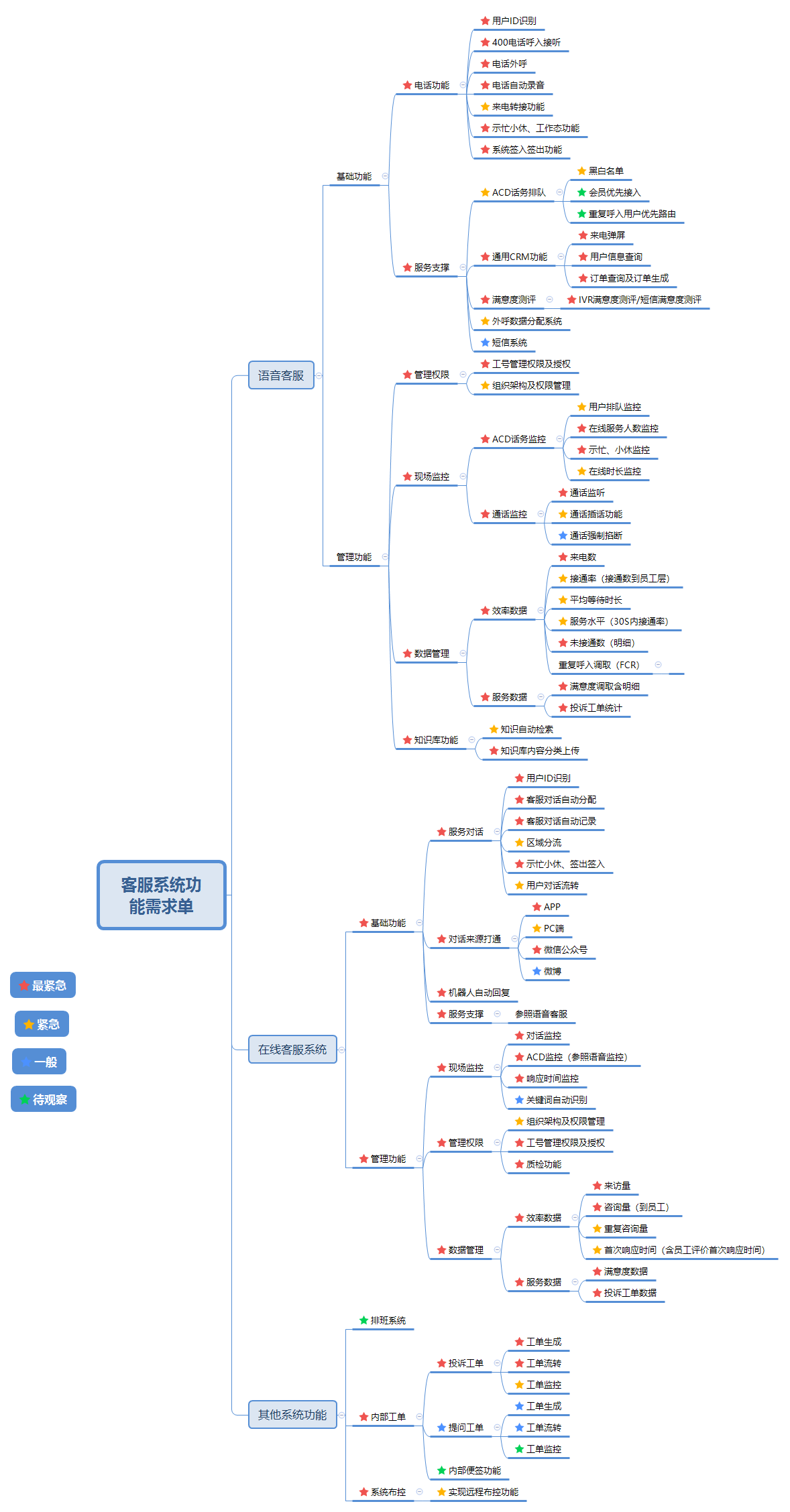 4、完成系统功能梳理之后需要对系统实现进行顺序化划分,针对不同系统功能实现需要进行优先级别划分,因为一个完整复杂的客服系统功能实现很难有一家供应商现有标准化系统能够完全满足需求。在无法满足需求的情况下对于系统需要进行定制化开发,定制化开发系统需要时间周期,所以需要优先实现比较继续的功能。详见图2。
