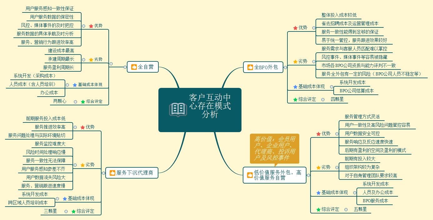 第三种为全BPO外包模式,相比较而言其优势比较明显主要为:整体投入成本较低、去招聘成本及运营管理成本、服务一致性能得到足够的保证、易于统一管控,服务跟进效果较好。但是其劣势也同样相当明显:服务需求与客服人员匹配难以掌控、风控事件媒体事件等容易被隐藏、市场各BPO公司资质与能力评判不一致、服务全外包有一定的风险(BPO公司人员不稳定等)