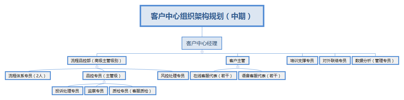人员招聘的前提是需要有组织架构,组织架构不是随便拍脑门想出来的,而是根据前文的业务流程、业务实现方式、工作流程共同来确定的。比如笔者咨询的项目客户服务中心因为承担着部分服务流程优化的工作内容所以前期会有:流程品控人员(流程优化、服务监察)、客服人员、培训及BPO对口人员,中期在服务监察部分需要有质检专员、投诉专员等根据业务发展来调整组织架构。同时,针对不同的组织架构优化不同岗位的工作职责及岗位说明书,根据岗位说明书招聘人员并培训上岗。下三图为笔者咨询项目短期、中期、长期的组织架构规划。