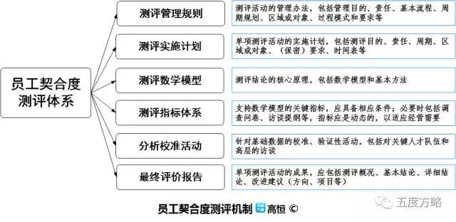 员工契合度测评体系由测评规则、实施计划、数学模型、指标体系、分析校准和最终报告六个部分构成。