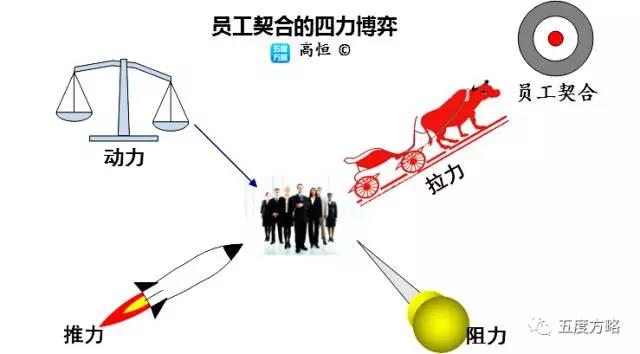 在员工与公司的契合过程中,存在多种力量之间的博弈:公司的积极争取(拉力)、绝大多数员工积极向上的愿望(动力)、家人的期望和社会大环境的改善(推力)、高绩效地区/行业/企业的吸引和竞争者的有形无形的邀约(阻力),都对员工产生影响。谁的力量大,谁就能占上风。