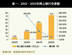 赛迪顾问管理与信息化事业部提供的报告显示,2005年中国网上银行业务高达72.6万亿元,相比较2003年的23.8万亿元,增长率达到了了308.23%(详见表一)。其中,企业网上银行的交易额为70.2万亿元,占到了总交易额的96.7%(详见表二)。