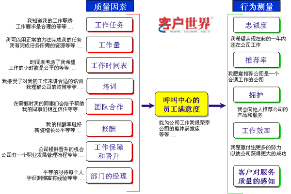呼叫中心的管理者也需要在影响呼叫中心员工满意度的诸多因素中,运用模型找出最需要改进的部分。下面就是一个典型的呼叫中心员工满意度测评模型(图1):