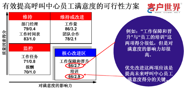 在满意度测评后,企业根据文中提到的优先矩阵方法进行分析,并采取不同的改进措施。如图2中列举的假设矩阵,对满意度分值低但影响力高的质量因素,如“工作保障和晋升”、“培训”等,这是导致耳唛天使们离职的根本原因,而且企业目前在这些领域的表现并不能让员工满意,企业必须重点改进;对满意度分值高而影响力也大的部分,如“工作量”和“团队合作”,说明呼叫中心在这方面做得不错,而且这部分对于员工满意度来说也是非常重要的因素,企业必须持之以恒、继续改进;而对满意度分值较低且影响力低的部分,如“工作任务”和“报酬”,虽然企业在这些领域目前做得也不好,但是和员工满意度的关系却不是最密切,企业需要做的只是实时监控,不需要分配资源进行改进;至于矩阵中员工满意度分值高而影响力弱的那部分,如“部门经理”和“工作时间表”,说明企业在这方面做得让员工尚且满意,但是这方面和员工满意度的联系相对较弱,所以企业只需要维持现状即可。
