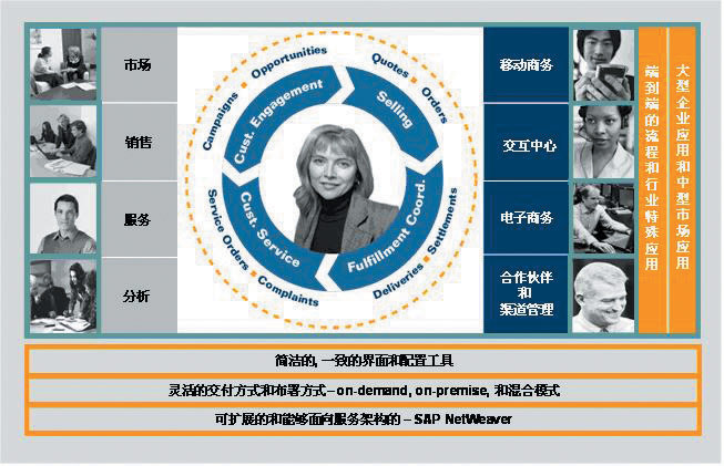 mySAP CRM不仅包含了企业市场营销、销售、服务、分析等功能,还通过渠道伙伴、现场和移动商务、交互中心、电子商务等各种交互渠道形成完整的闭环式设计的解决方案。在提供深入的行业应用和传统的部署方式的同时,mySAP CRM 还提供按需租用的部署方式。