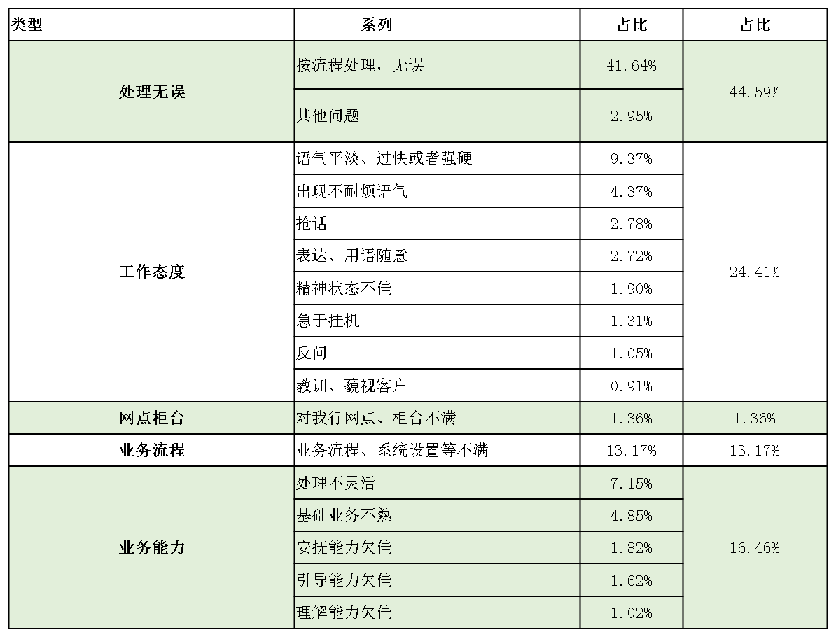 通过对不满意电话监听分析,处理无误、网点柜台问题和业务流程等非坐席因素引发的不满意电话占比合计约59%,座席因素不满意电话工作态度问题占比24.41%、业务能力占比16.46%,合计约41%,需重点分析。