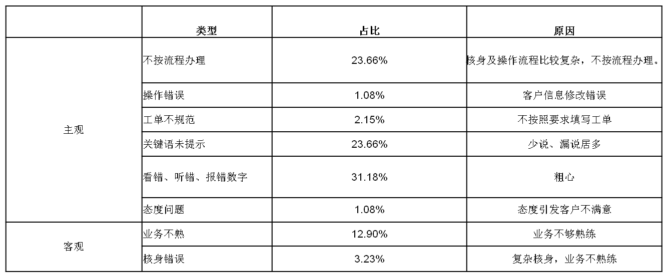 客观方面,员工遇到复杂核身和疑难业务时,出现业务不够熟练导致的不合格占比16.13%。此类不合格需要统一培训,建议总结疑难业务和复杂核身情况,形成统一培训脚本,提高培训针对性。针对个别员工,个性化培训和辅导,并加大该类业务监听比例和辅导力度。