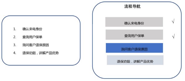 流程状态导航,是指座席辅助系统主动提示客服,当前的所处的状态为流程中的哪一个环节,以及提示下一步的流程环节。以“退保”为例,客服按照公司流程,需要涉及4个主要环节。