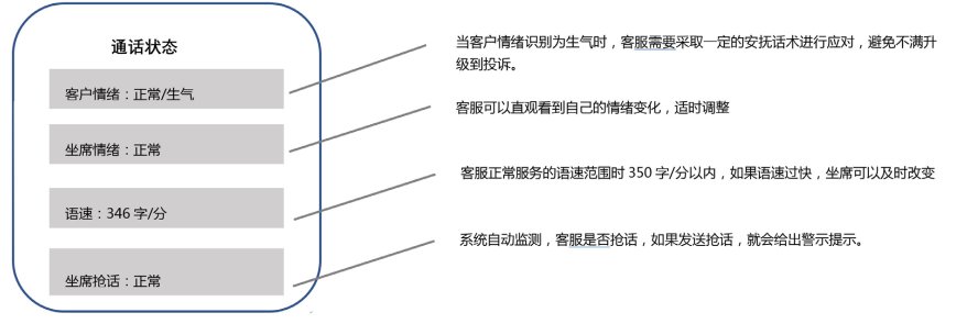 除了在文本内容介入,协助客服提高客户的满意度之外,座席辅助系统,还能及时监测客服的服务语气/服务态度/语速等语音条件,提升客服和客户的语音交互对话,这就是通话状态的监控,监控的对象往往是双向的,即既有对客户语气的监控,也有对客服人员的监测。