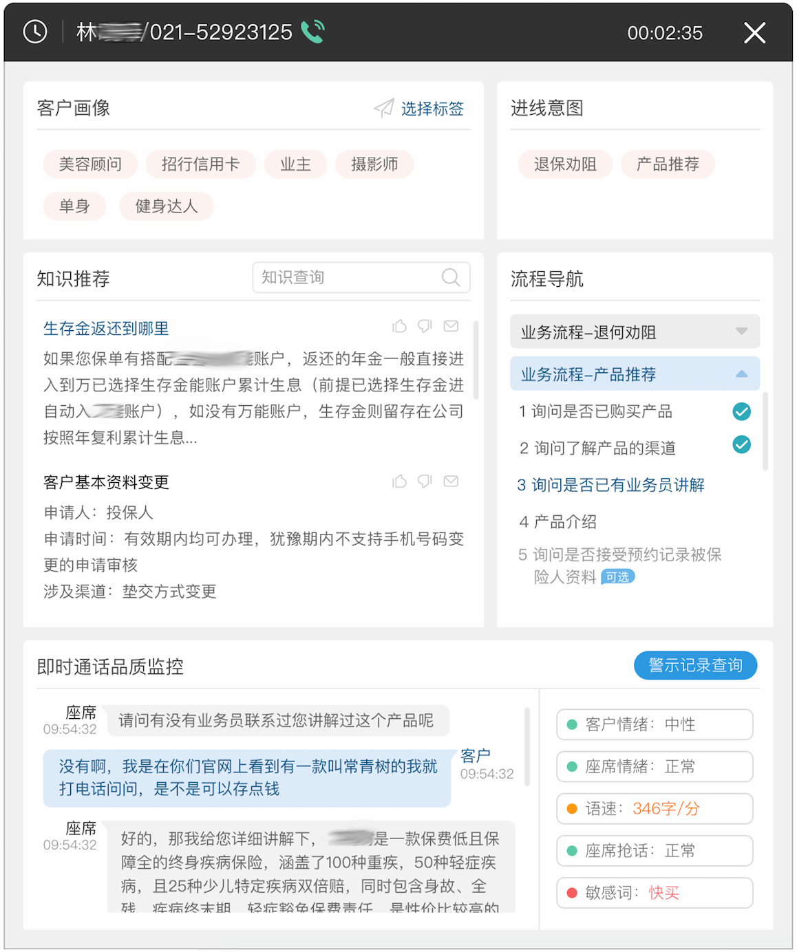 通过IVR派发的一通电话,客服往往无从了解到客户的具体信息,如电讯的历史记录、业务记录、客户职业、用户偏好这些。但是通过座席辅助系统,用户一旦接入,客服即可在界面上看到客户的用户画像,这些用户画像以标签形式进行展现,如“美容顾问”、“信用卡办理”、“健身达人”等,有了这些标签,客服人员就可以做到知己知彼,有的放矢了。